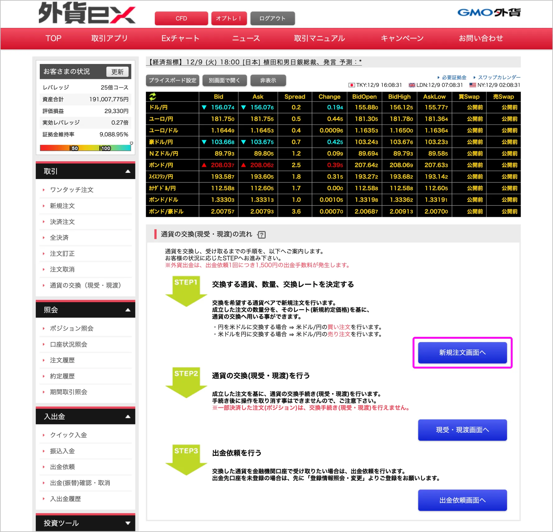 「新規注文画面へ」をクリックし、ポジションを建てます。