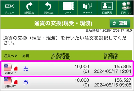 今回現受・現渡をするポジションを選択します。